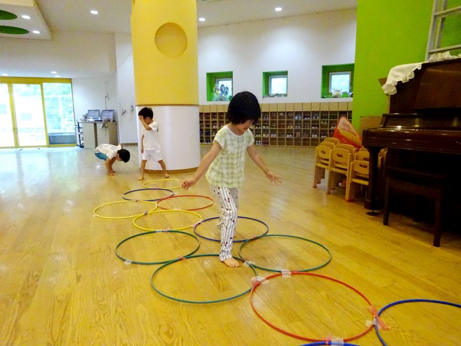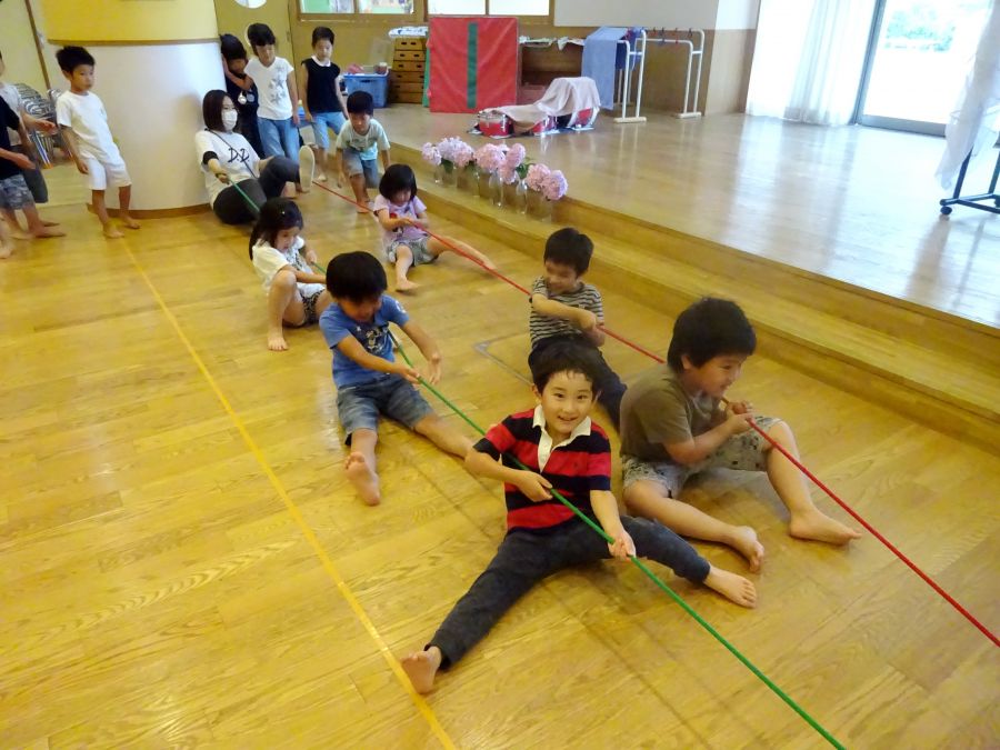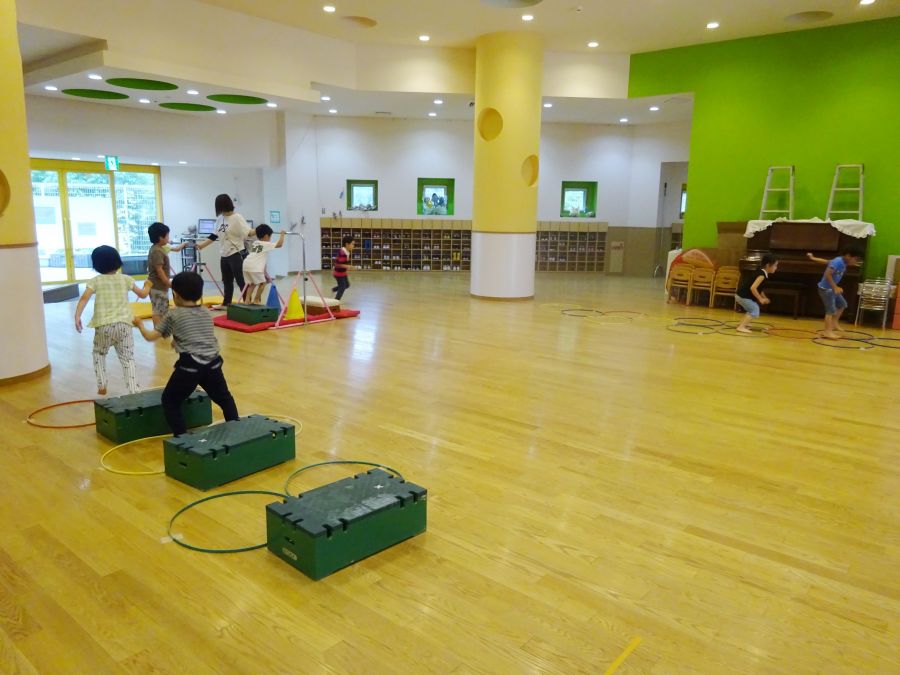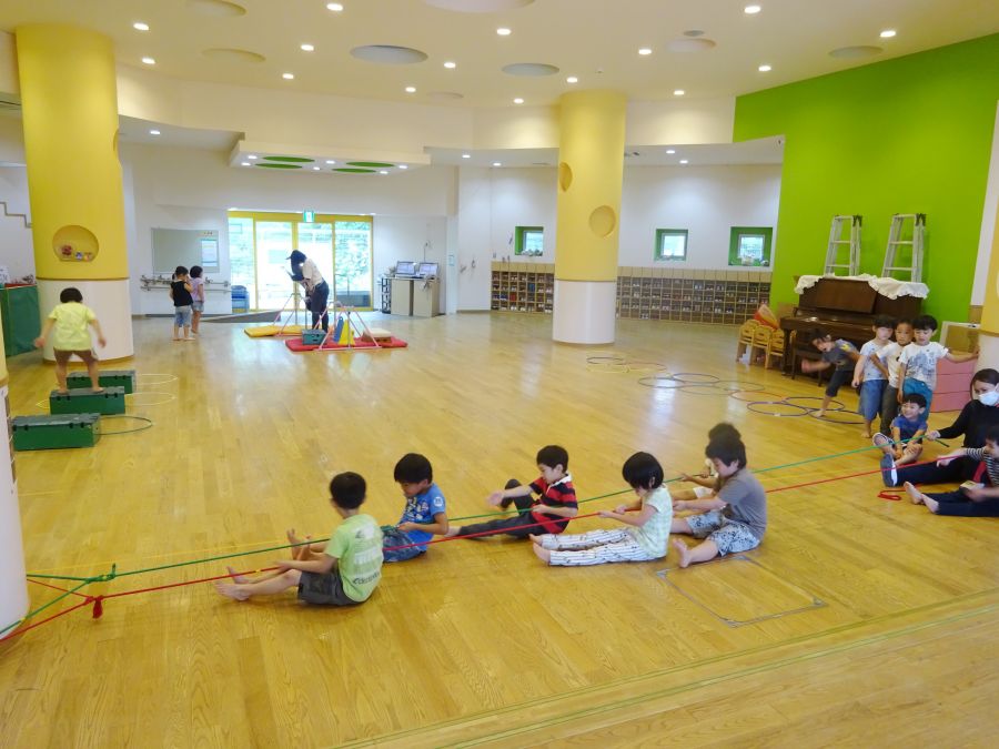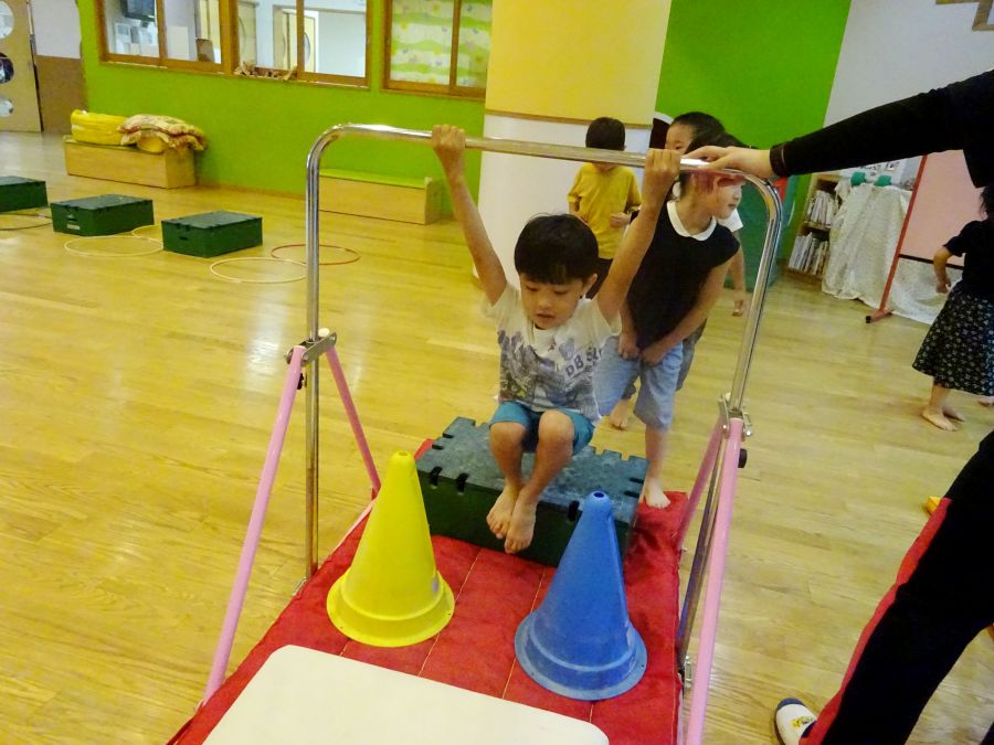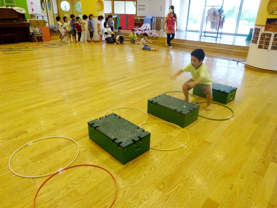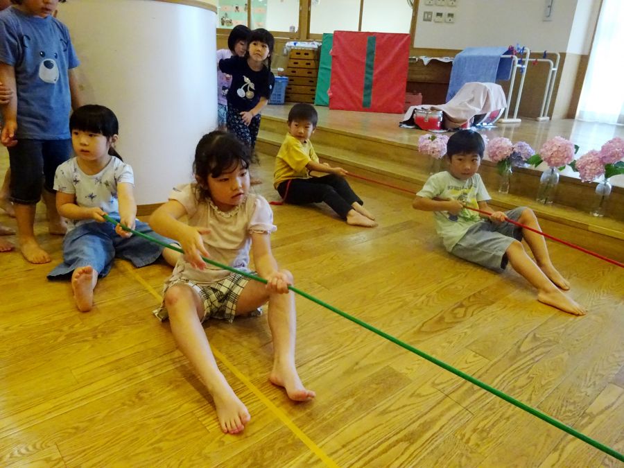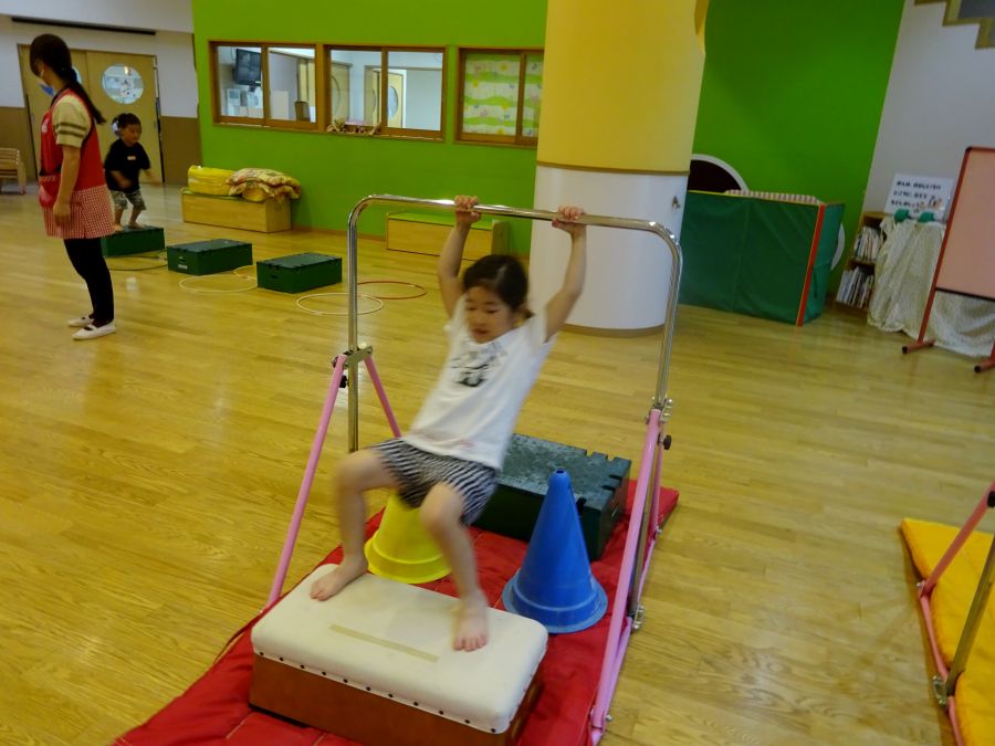 今日は雨でなかなか外に出られないので、ホールでサーキットをしました。 1.フープで連続ジャンプ 2.柱にくくりつけたロープを引っ張って、腕の力だけで進もう 3.巧技台で両足ジャンプ 4.鉄棒で前回りか、コーンをよけて跳び箱までワープ ロープは消防隊員のようで子どもたちに大人気でした! これから雨の日も多くなるので、そんな日でも室内でたくさん体を動かして発散できたらと思います。