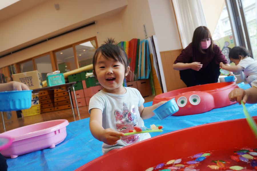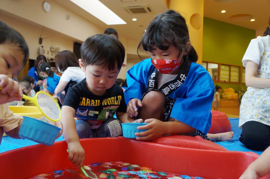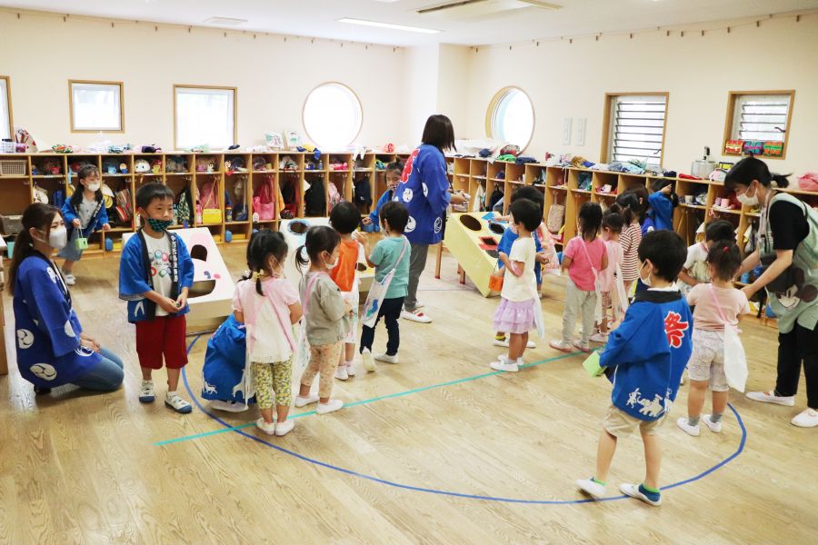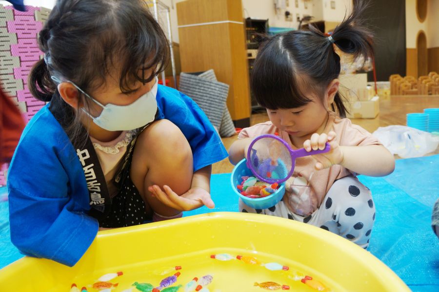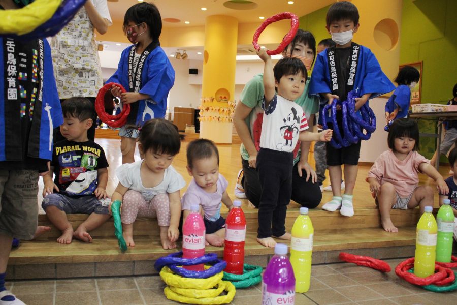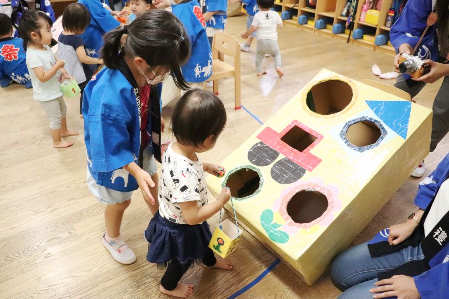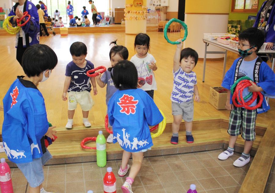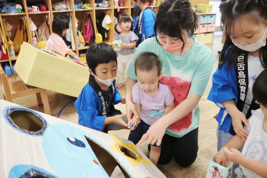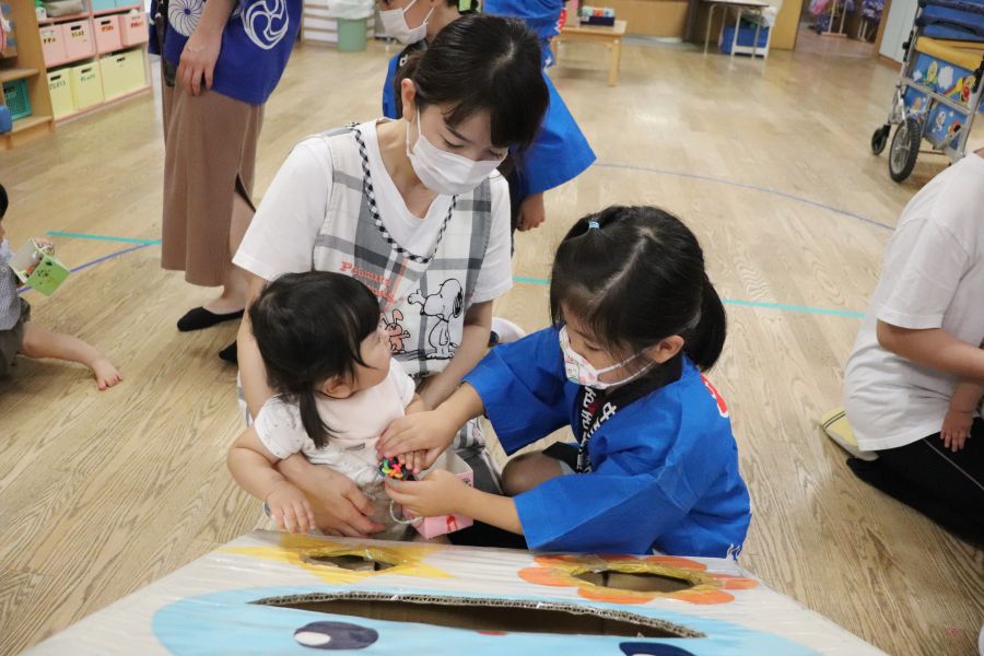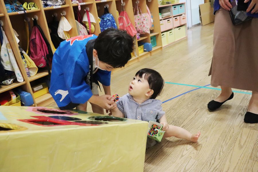 わなげ・金魚すくい・ナイスボール・ラムネすくいの4コーナーのお店で、5歳児ほし組さんがお店当番をしました。
