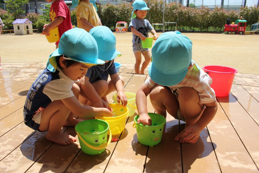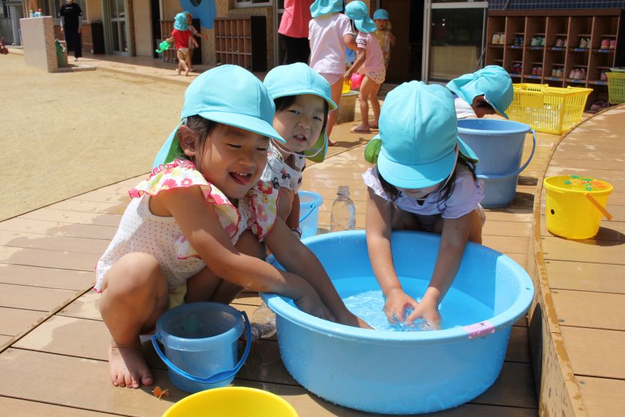 今日は天気が良く暑かったので、一足先に水遊びを楽しんだそら組さん。 まずはデッキに並んだタライに自分たちで水を運びます。 こぼさないようにそーっと歩いて運んだ後は、水に金魚や亀のおもちゃを浮かべて水遊びスタート! 「気持ちいい~!」と、つい入りたくなってタライに足だけいれてみたりと、本格的な水遊びが待ち遠しい様子です。