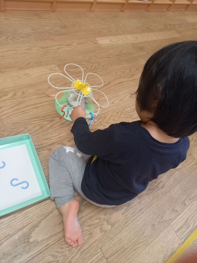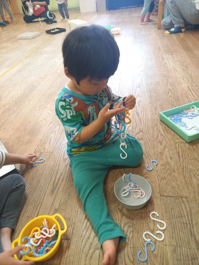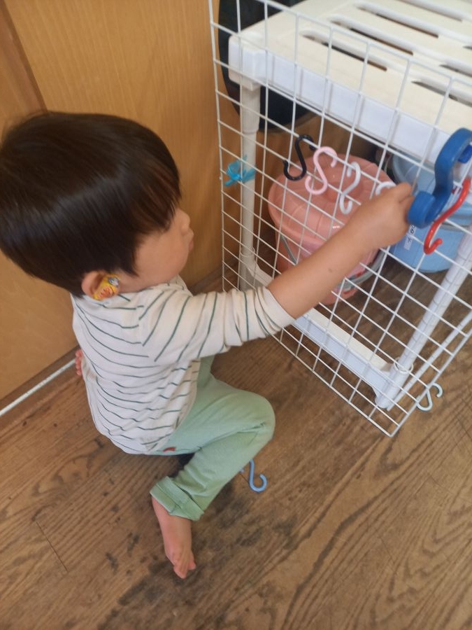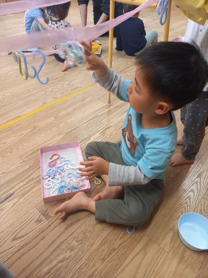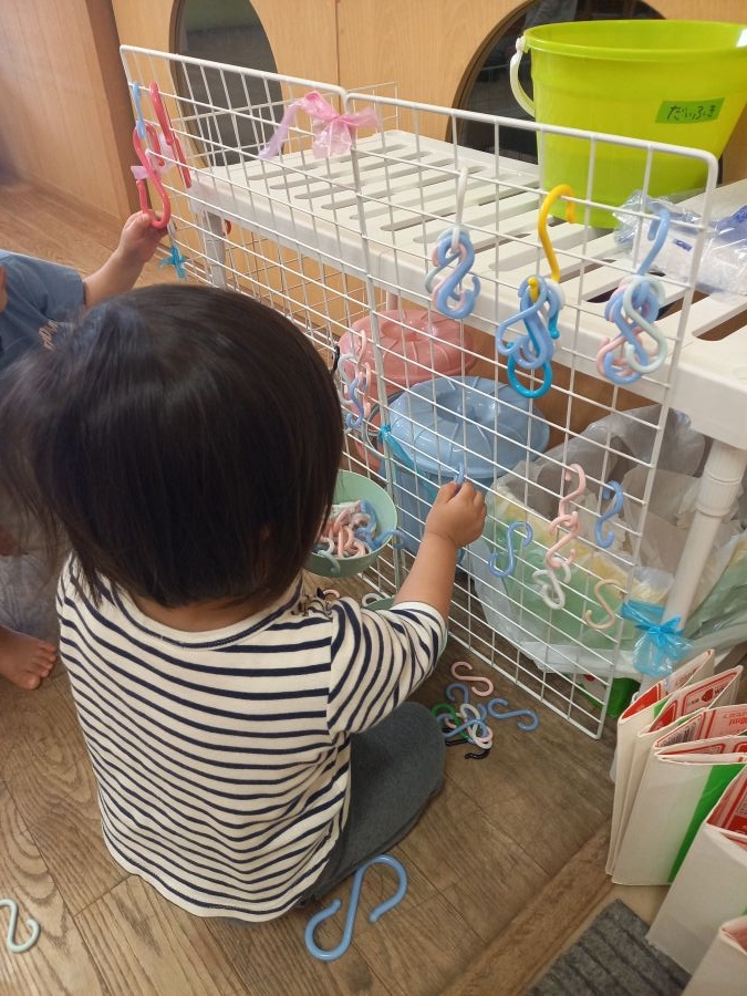2歳児あひる組はS字フックで遊びました。 いろんなところにひっかかるS字フック。 ここにくっつけられる!と見つけると 嬉しそうに教えてくれていました! S字フック同士もくっつくので黙々と 集中して遊んでいましたよ!