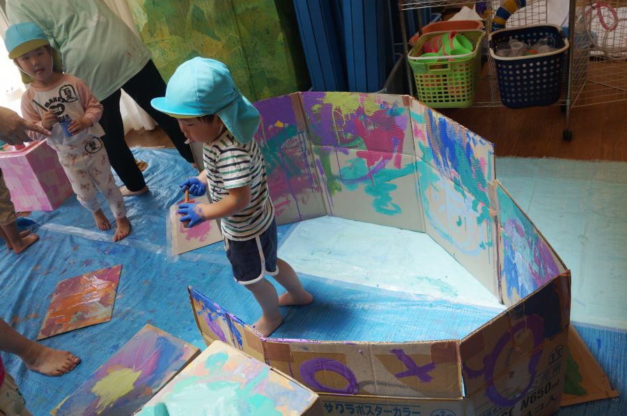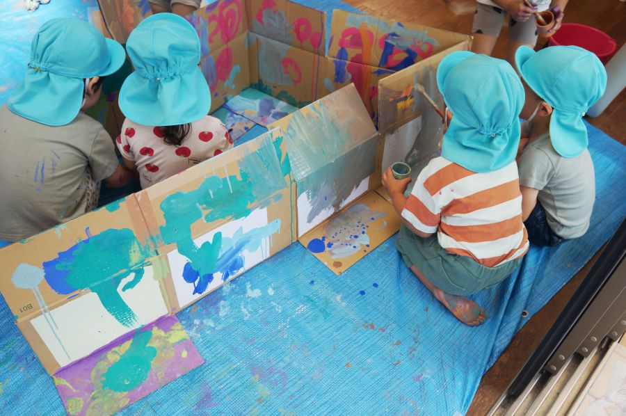 初めは慎重に筆を動かしていた子どもたちですが、気づけば手のひらで絵の具を塗り広げたり、カップの絵の具を垂らしてみたりと、どんどんと大胆に絵の具の感触を楽しんでいましたよ。