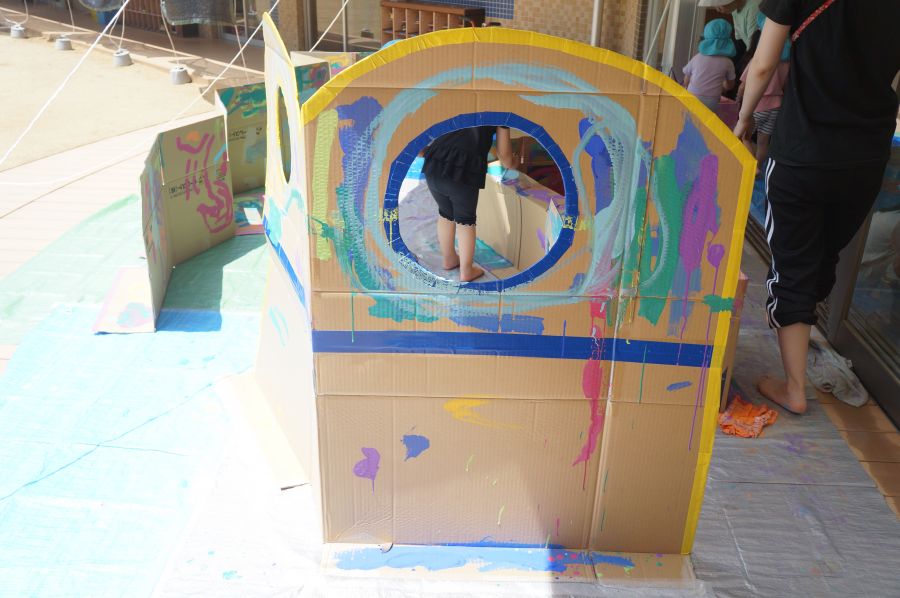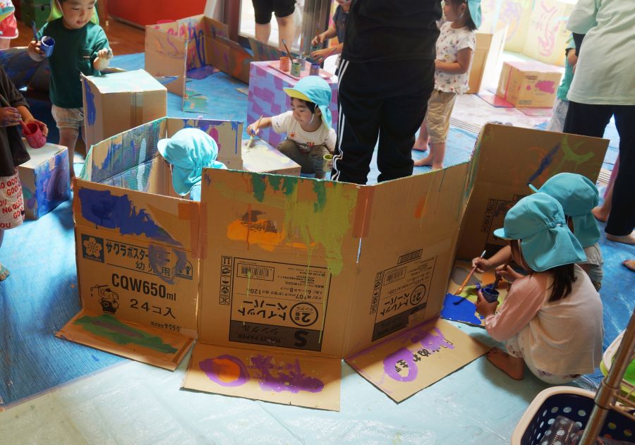 カップに入った好きな絵の具を選んで、段ボールにペタペタぬりぬりして遊びました。
