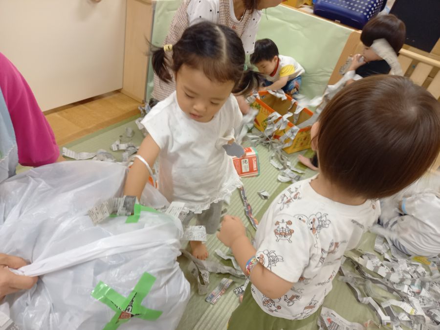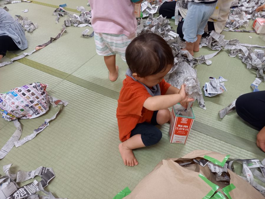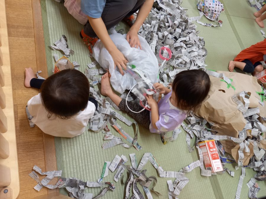 新聞をビリビリ~ たくさんの新聞に大喜びのこどもたちです! ゆっくり座ってひたすら箱に入れたり、ビニール袋の穴から 新聞をひっぱりだしたり、プールのようにダイブしてみたり!! 次から次へと遊びを見つけて楽しんでいました。 雨の日の室内遊びでしたがこども達は大満喫で楽しんでいましたよ♪