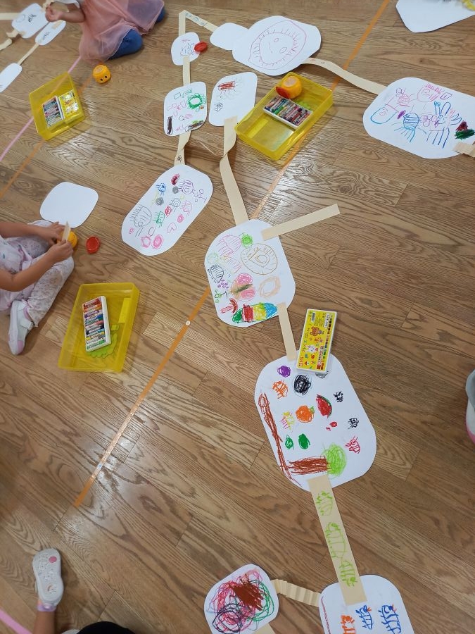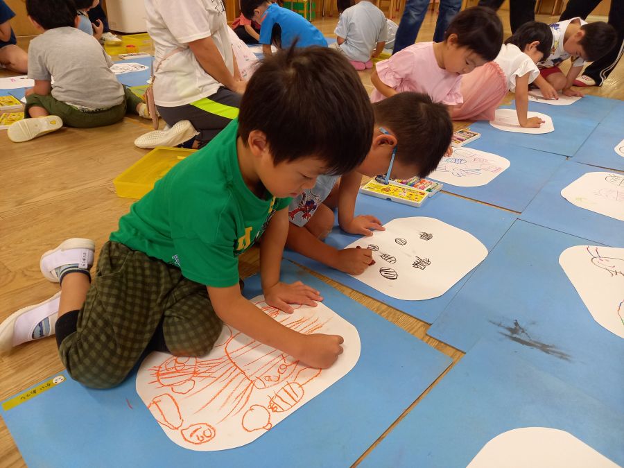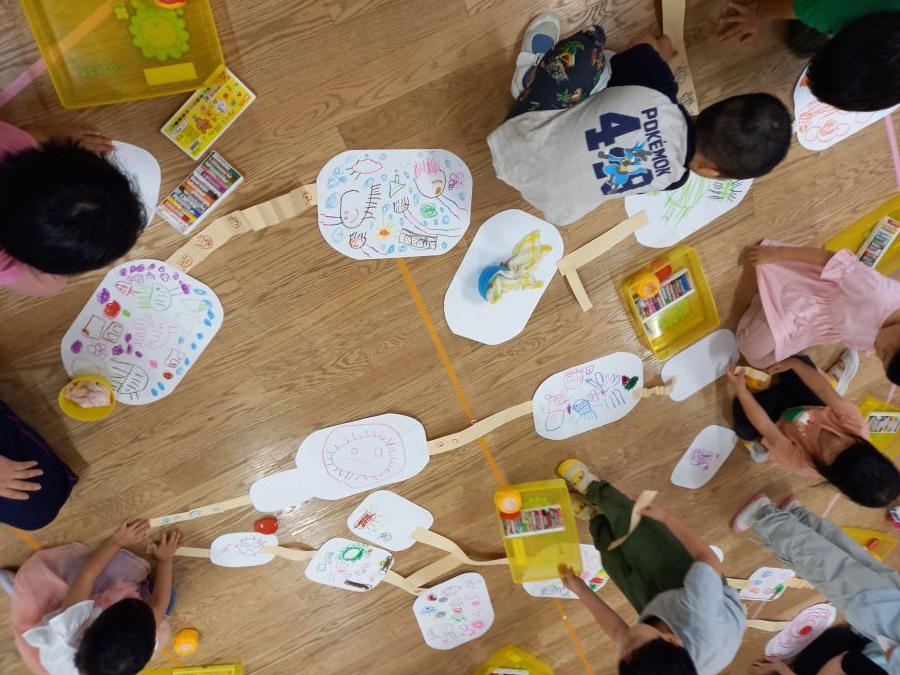 みんなの大好きなだんごむしの絵を描きました! まずは集中して自分のイメージするだんごむしを描いて… 途中、先生の「だんごむしさんは何が好きかな~?」 という言葉を聞いて、いろいろ描き足していました♪ そこからおかわりの紙をもらったり、紙と紙を繋げられる道が でてきたり!! こどもたちは目を輝かせながらお友達と繋げたりして、話も盛り上がり、とっても楽しそうでしたよ!
