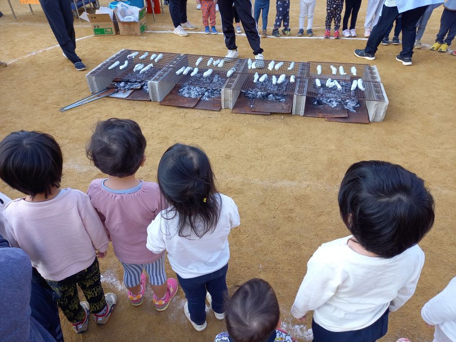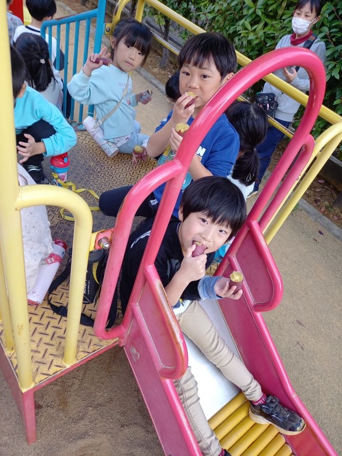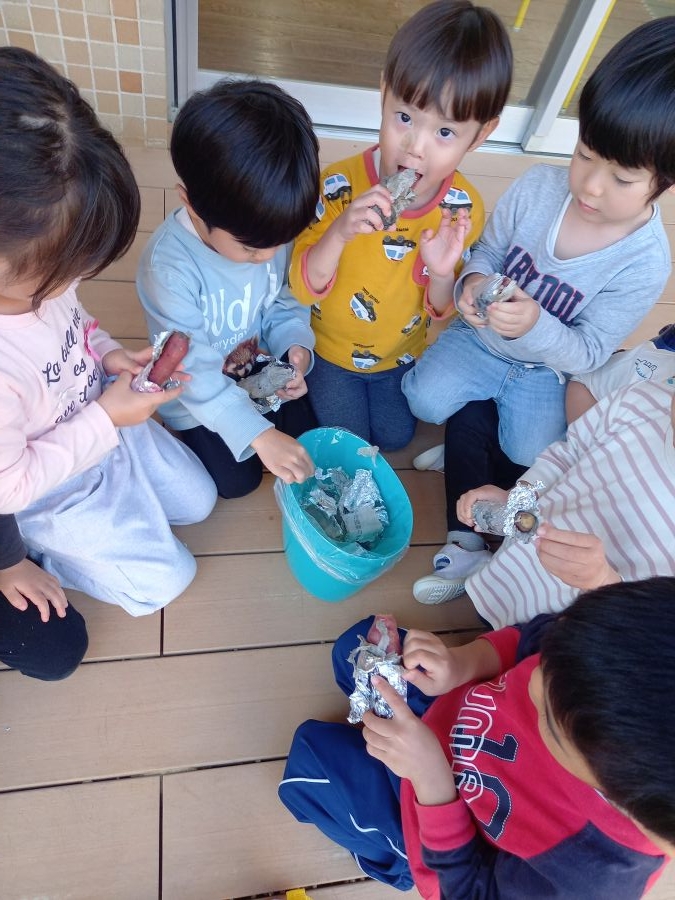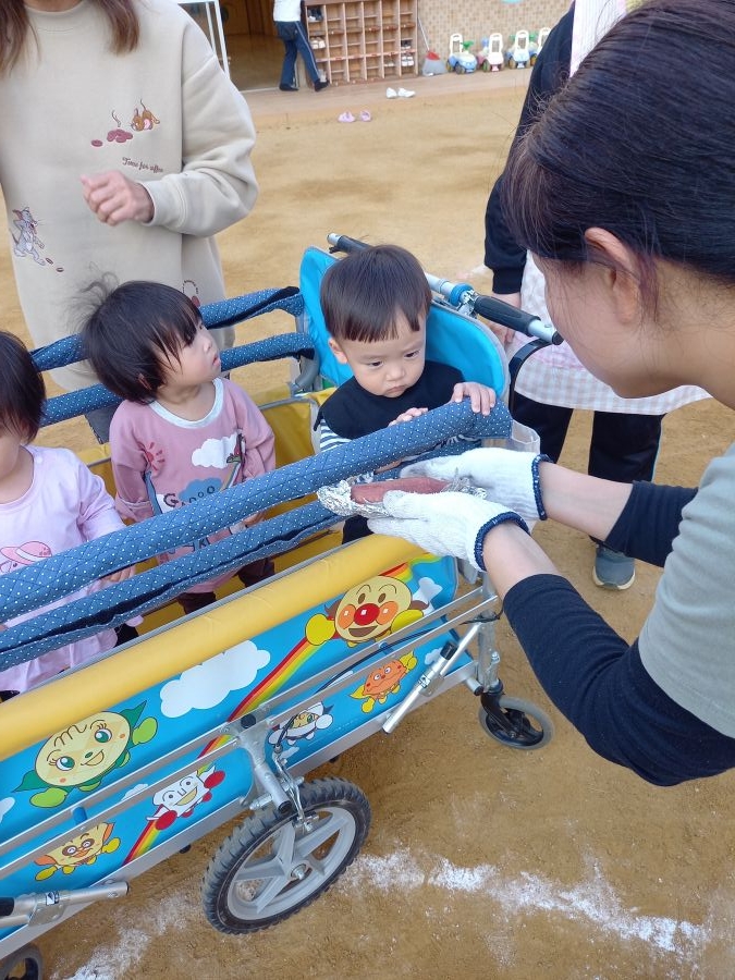 まちにまったやきいも会です♪ 朝から自分でいもを選び、やきいもの準備をしました! 役員の方もお手伝いしていただき、 おいしそうなおいもが完成しました。 幼児ぐみさんは自分の用意したいもを受け取ると嬉しそうに 食べていましたよ。 自分で準備したおいもは特別ですね。 乳児ぐみさんもほくほくのおいもたくさん食べました~ おいしかったね。