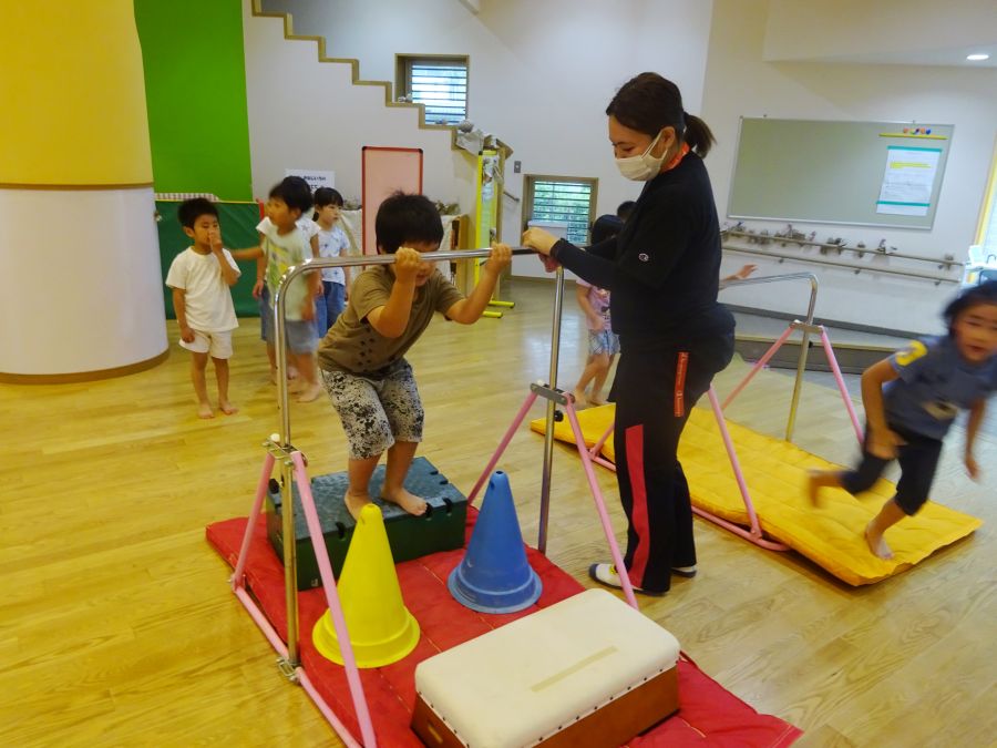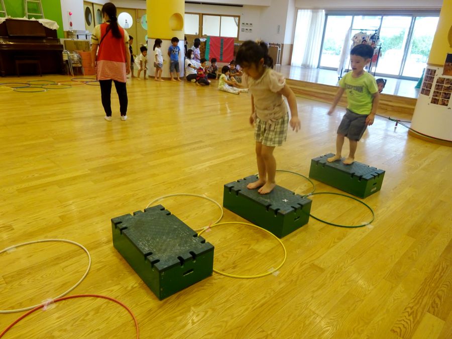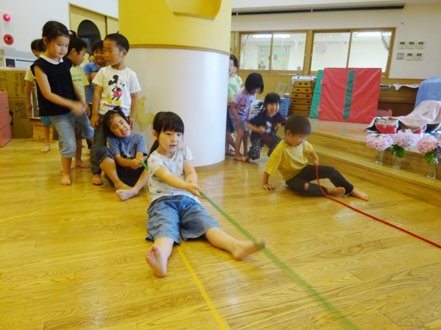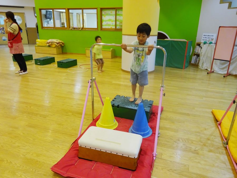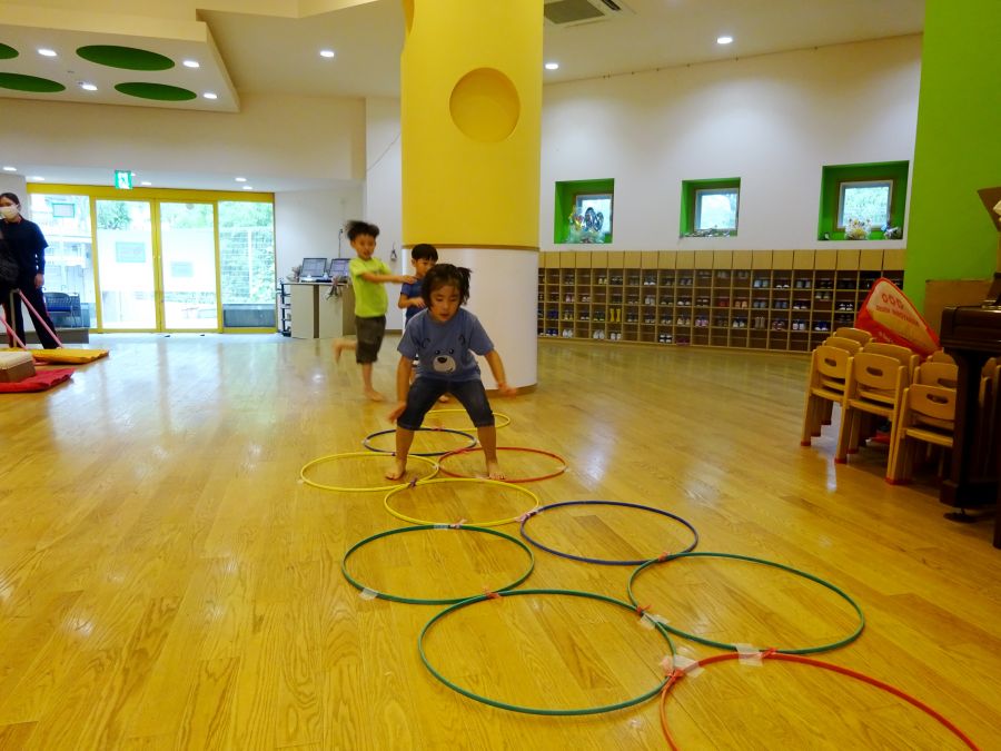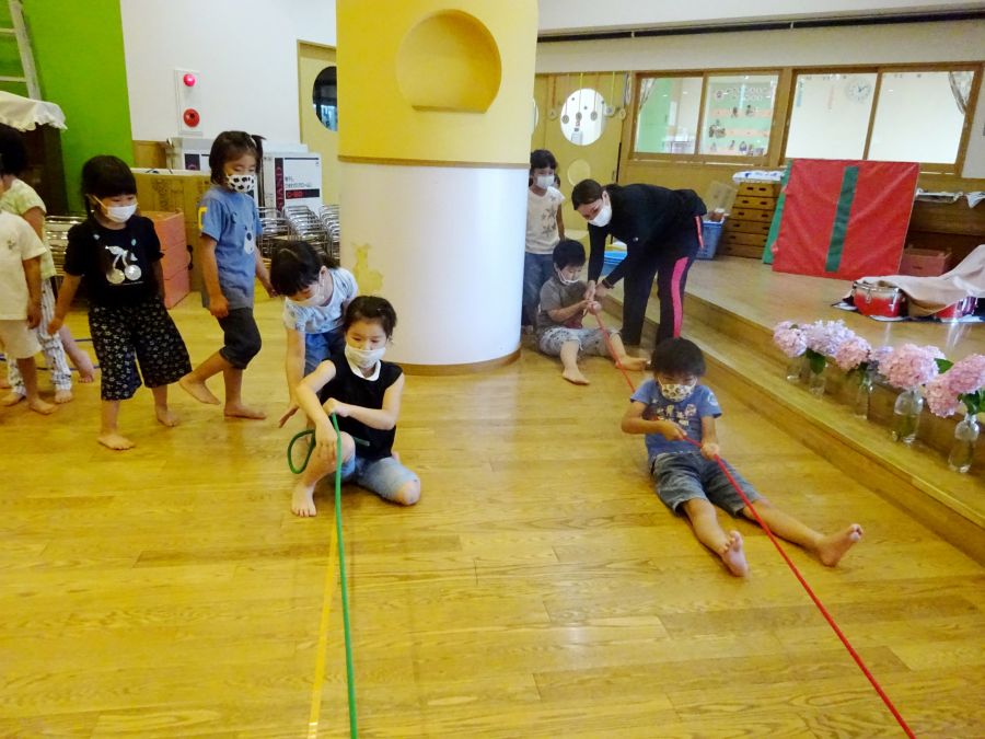 今日は雨でなかなか外に出られないので、ホールでサーキットをしました。 1.フープで連続ジャンプ 2.柱にくくりつけたロープを引っ張って、腕の力だけで進もう 3.巧技台で両足ジャンプ 4.鉄棒で前回りか、コーンをよけて跳び箱までワープ ロープは消防隊員のようで子どもたちに大人気でした! これから雨の日も多くなるので、そんな日でも室内でたくさん体を動かして発散できたらと思います。