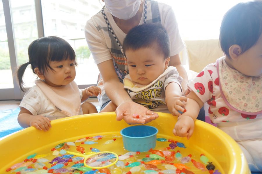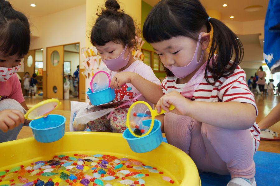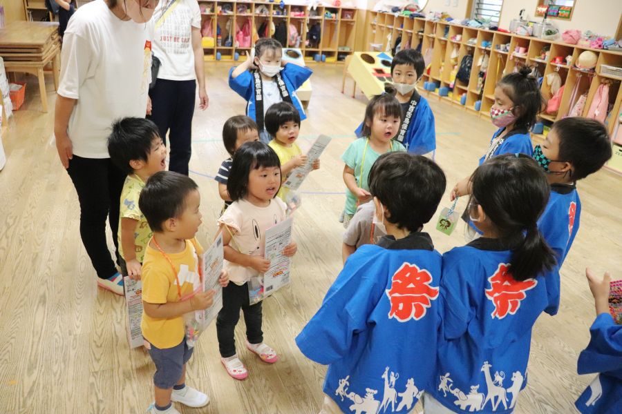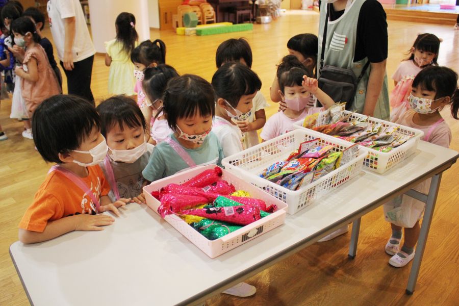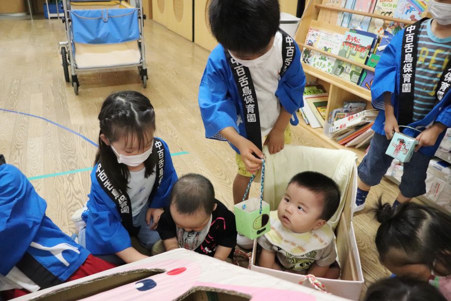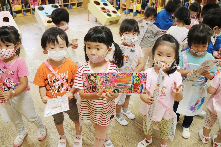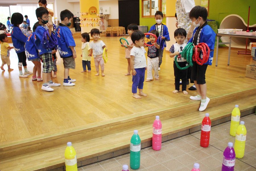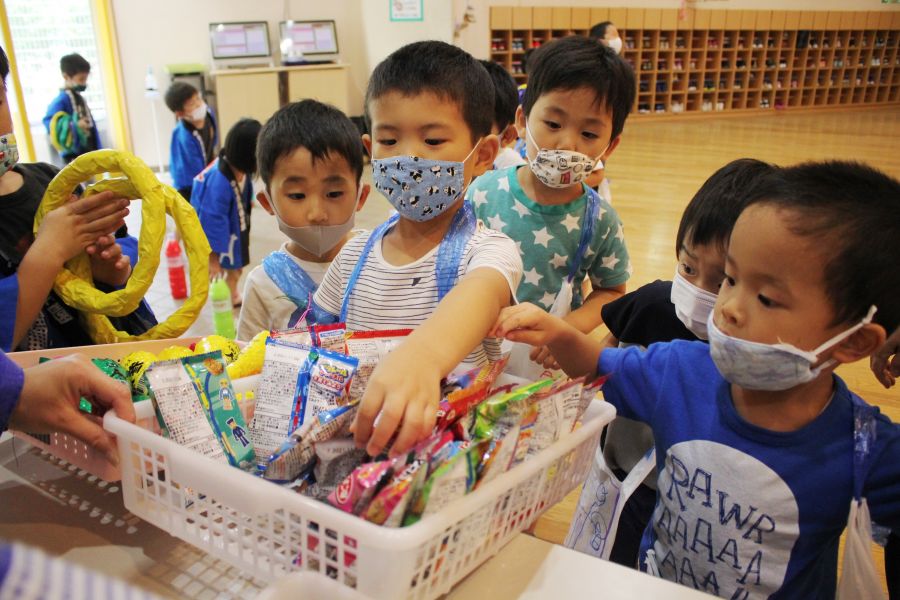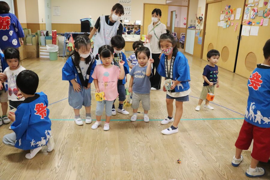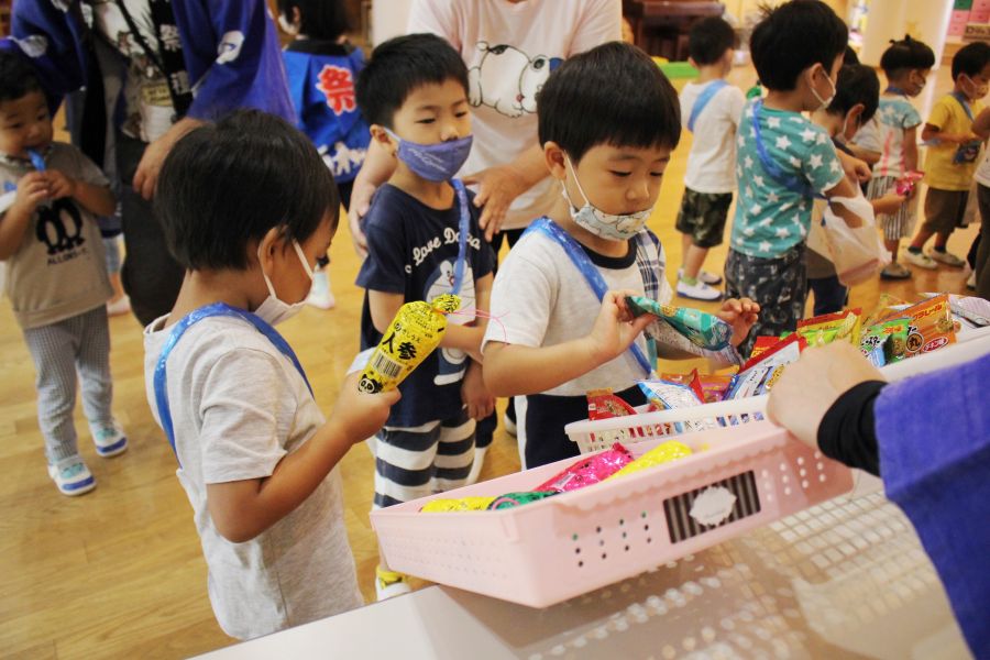 わなげ・金魚すくい・ナイスボール・ラムネすくいの4コーナーのお店で、5歳児ほし組さんがお店当番をしました。