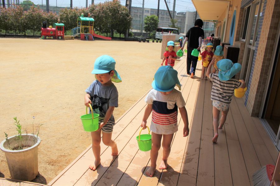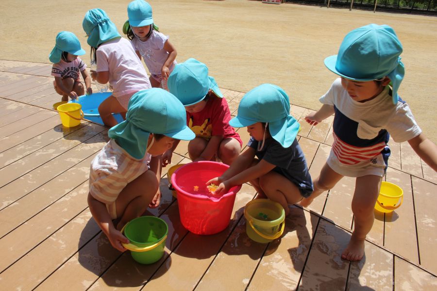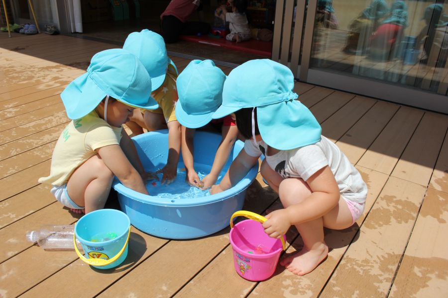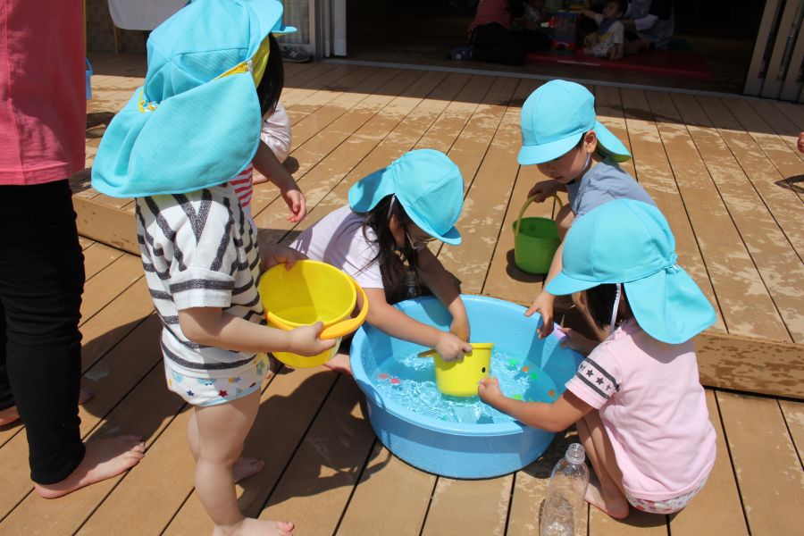 今日は天気が良く暑かったので、一足先に水遊びを楽しんだそら組さん。 まずはデッキに並んだタライに自分たちで水を運びます。 こぼさないようにそーっと歩いて運んだ後は、水に金魚や亀のおもちゃを浮かべて水遊びスタート! 「気持ちいい~!」と、つい入りたくなってタライに足だけいれてみたりと、本格的な水遊びが待ち遠しい様子です。