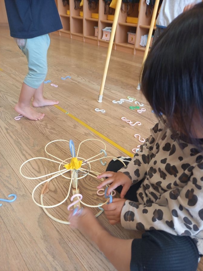 2歳児あひる組はS字フックで遊びました。 いろんなところにひっかかるS字フック。 ここにくっつけられる!と見つけると 嬉しそうに教えてくれていました! S字フック同士もくっつくので黙々と 集中して遊んでいましたよ!