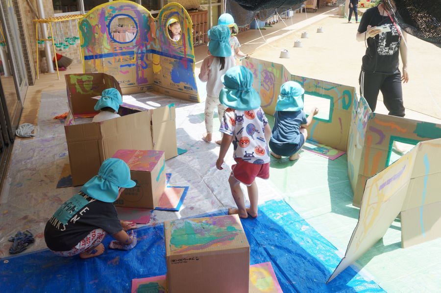 初めは慎重に筆を動かしていた子どもたちですが、気づけば手のひらで絵の具を塗り広げたり、カップの絵の具を垂らしてみたりと、どんどんと大胆に絵の具の感触を楽しんでいましたよ。