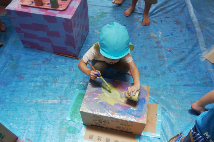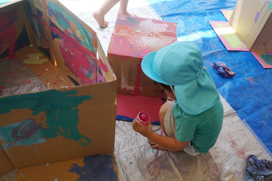 カップに入った好きな絵の具を選んで、段ボールにペタペタぬりぬりして遊びました。