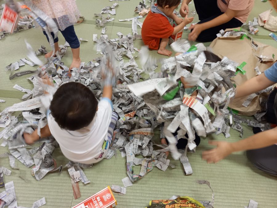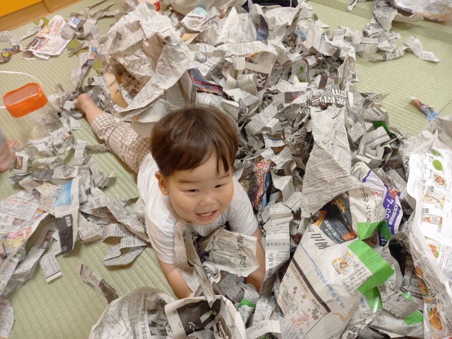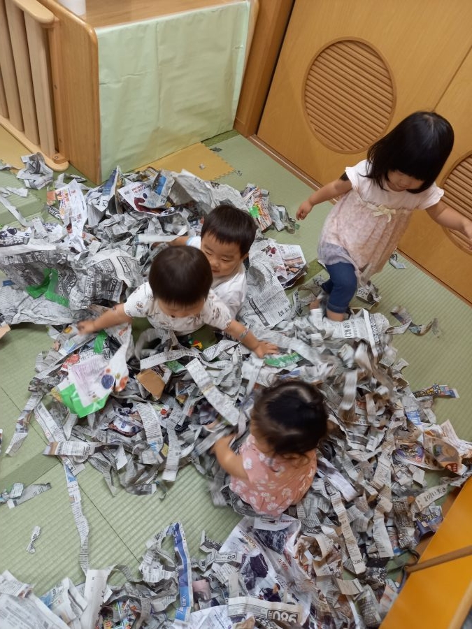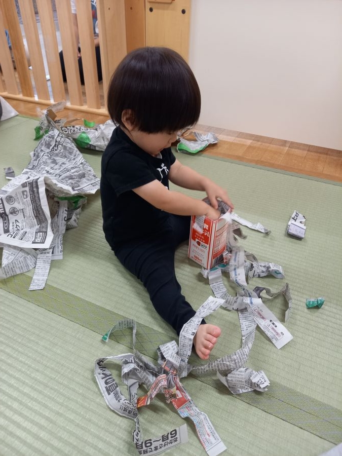 新聞をビリビリ~ たくさんの新聞に大喜びのこどもたちです! ゆっくり座ってひたすら箱に入れたり、ビニール袋の穴から 新聞をひっぱりだしたり、プールのようにダイブしてみたり!! 次から次へと遊びを見つけて楽しんでいました。 雨の日の室内遊びでしたがこども達は大満喫で楽しんでいましたよ♪