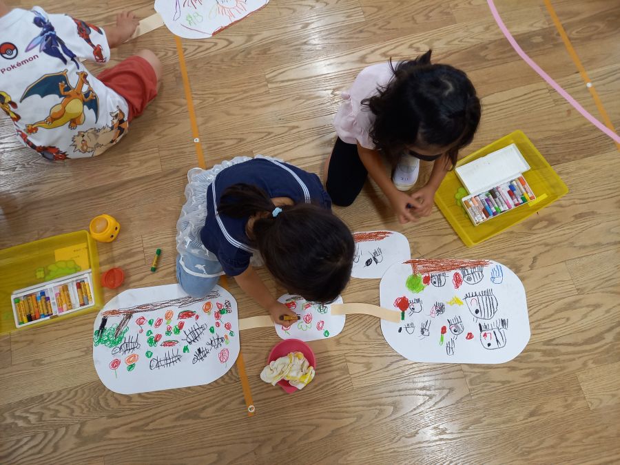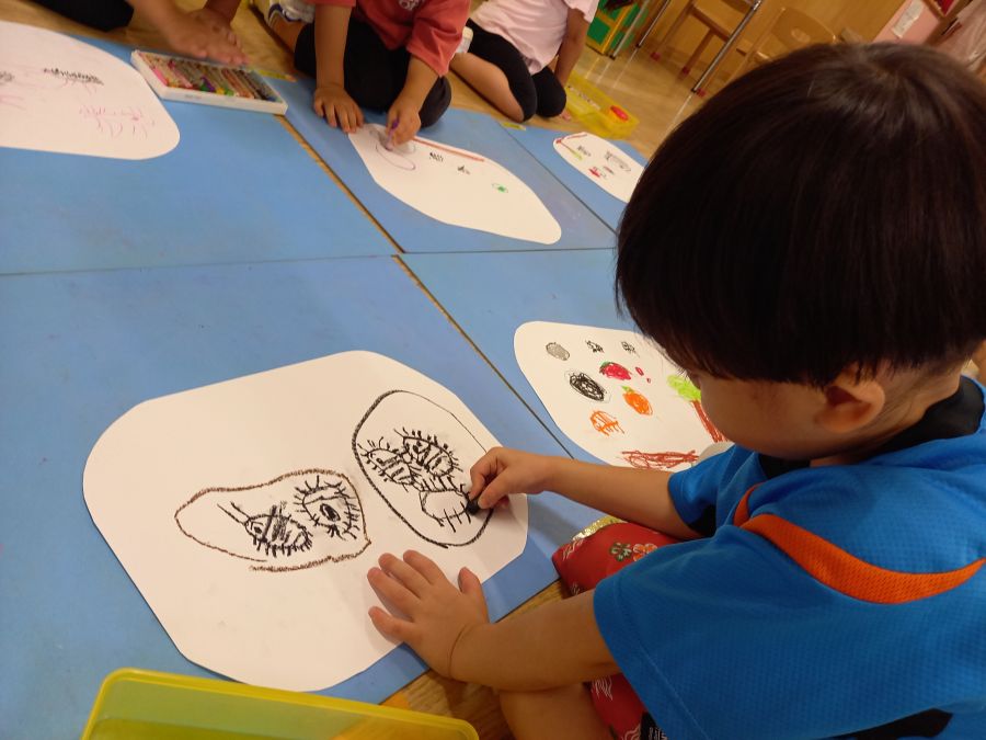 みんなの大好きなだんごむしの絵を描きました! まずは集中して自分のイメージするだんごむしを描いて… 途中、先生の「だんごむしさんは何が好きかな~?」 という言葉を聞いて、いろいろ描き足していました♪ そこからおかわりの紙をもらったり、紙と紙を繋げられる道が でてきたり!! こどもたちは目を輝かせながらお友達と繋げたりして、話も盛り上がり、とっても楽しそうでしたよ!