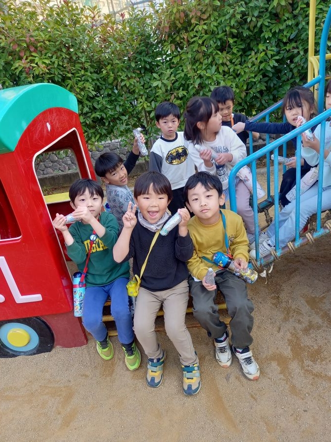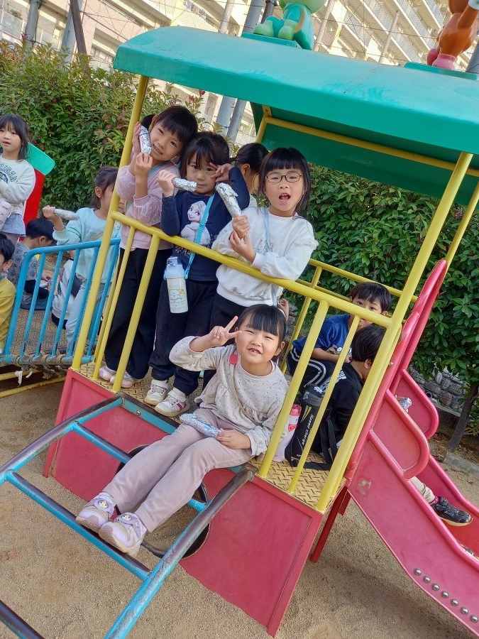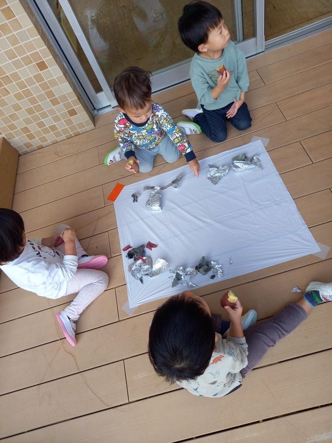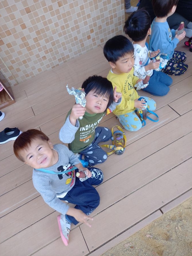 まちにまったやきいも会です♪ 朝から自分でいもを選び、やきいもの準備をしました! 役員の方もお手伝いしていただき、 おいしそうなおいもが完成しました。 幼児ぐみさんは自分の用意したいもを受け取ると嬉しそうに 食べていましたよ。 自分で準備したおいもは特別ですね。 乳児ぐみさんもほくほくのおいもたくさん食べました~ おいしかったね。